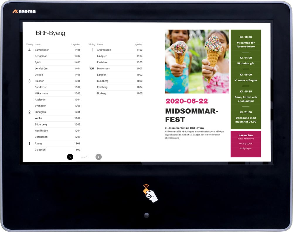 Informations- och bokningstavla C205 är designad för placering innanför flerbostadshusets trapphusentré såväl som vid tvättstugan eller i en elegant receptionsmiljö på företaget. Tavlan har en stor 21,5″ pek-skärm lämplig för visning av information, t ex. boenderegister, reklam för närbutiken, eller allmän information till boende som t ex. städdagar eller renoveringar. Som administratör lägger man enkelt upp vad som ska visas, med PDF-filer och websidor, och schemastyrningen gör att olika informationssidor kan visas under inställd tid för att sedan visa nästa osv. Information kan också anpassas för visning per trappuppgång alternativt i samtliga skärmar.C205 är fullt integrerad i VAKA-systemet vilket t ex innebär att data för bokningar och boenderegister hämtas automatiskt från systemet. Den integrerade pekskärmen, som normalt är i nedsläckt energisparläge och tänds upp först när någon närmar sig, visar vald information för boende, besökare och personal. Den integrerade läsaren är kompatibel med de flesta av marknadens passerbrickor (eller kort) och en behörig bricka startar bokningssidan på skärmen där man mycket enkelt väljer objekt, t ex. tvättstugan eller konferensrummet, ser tillgängliga dagar/tider och bokar direkt via den lättanvända pekskärmen. Bokningen är webbaserad och det går givetvis också boka via dator, surfplatta eller smartphone. Information- och bokningsfunktionen förutsätter att B60 domäncentral finns installerad i VAKA-systemet. C205 är en vidareutveckling med flertalet förbättringar som även gör installationen smidigare, t ex finns justerbara ställskruvar för att kompensera vid montering på ojämna väggar.Vandaltålig pulverlackerad ramSecufast bits T20 för montering ram/backstycke21.5″ Pekskärm med härdat glasUpplösning: IPS 1920 x 1080 (HD)RFID läsare: EM4200, MIFARE & MIFARE DESFireAnslutning: Standard RJ45Strömförsöjning: 48V PoE enligt IEEE 802.3 at.Temperaturområde: 0º +50º CStrömförbrukning: 6 W vila / 17 W maxStorlek: 445x560x55 mm (HxBxD)